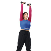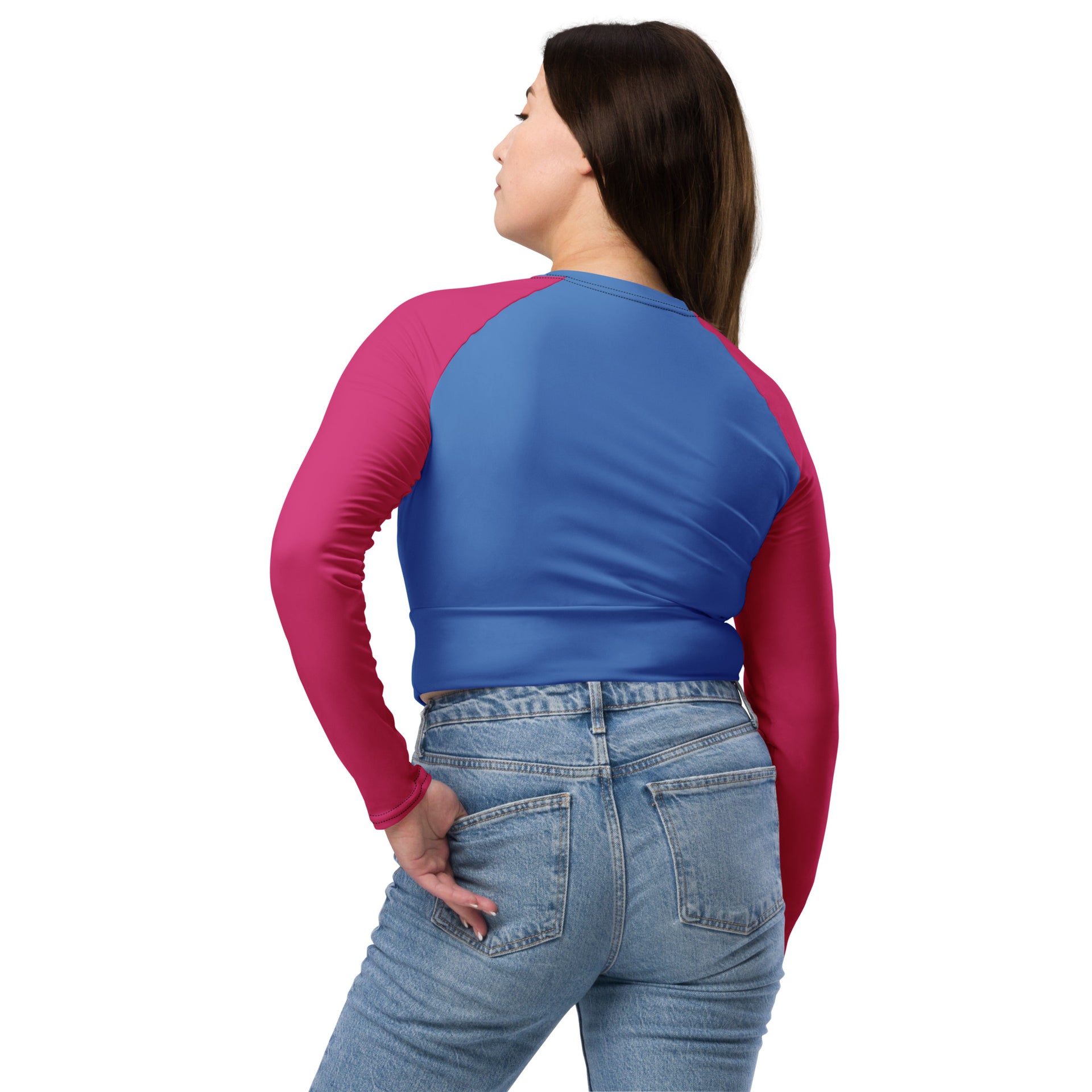 This long-sleeve crop top is made of recycled polyester and elastane, making it an eco-friendly choice for swimming, sports, or athleisure outfits.  The crop top has a tear-away care label and a wide, double-layered waistline band for a comfortable fit.